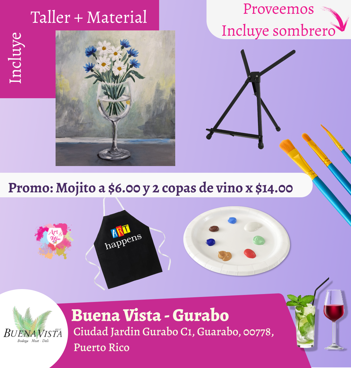 La compra de cada boleto incluye todos los materiales necesarios para realizar el arte y, si lo deseas, puedes llevar tu propia botella de vino, nosotros nos encargamos de servirte y brindar las copas. Puedes llevar otras bebidas también
