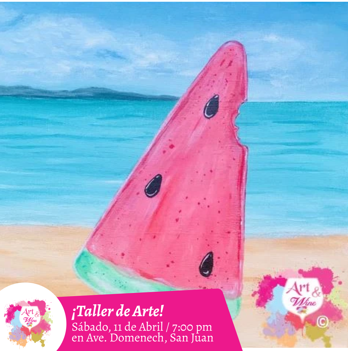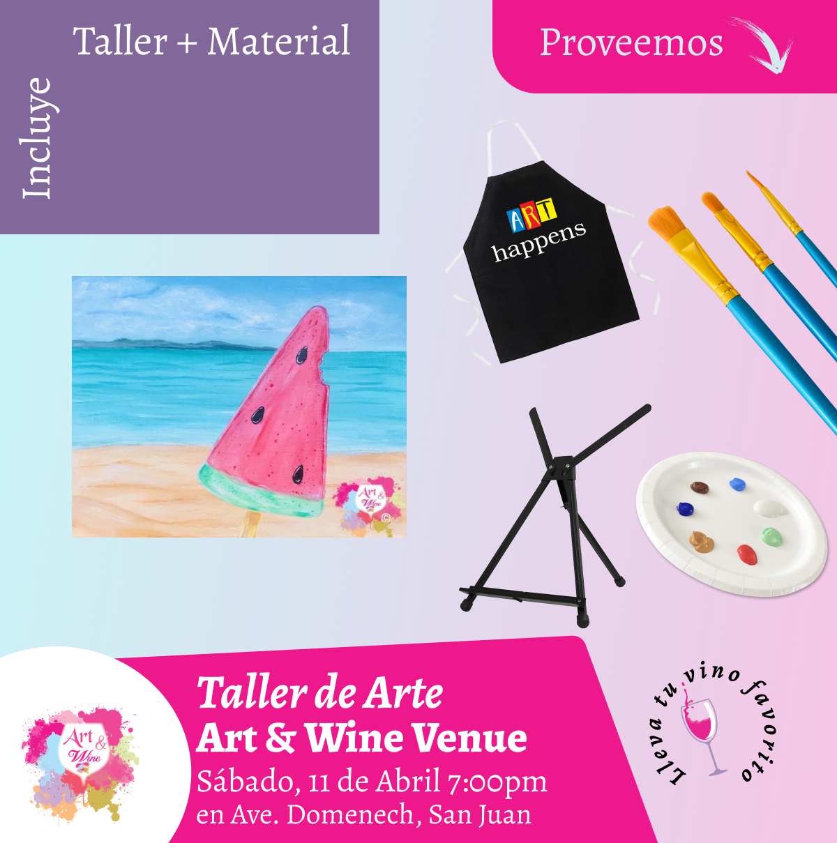 🎨¡Taller de arte en Art & Wine Venue 7pm - Sábado, 11 de Abril 2026 en San Juan. ¡Lleva tu vino favorito!